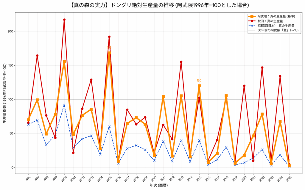 - しかし、堅果類(ドングリ工場)は長期的には痩せてきている